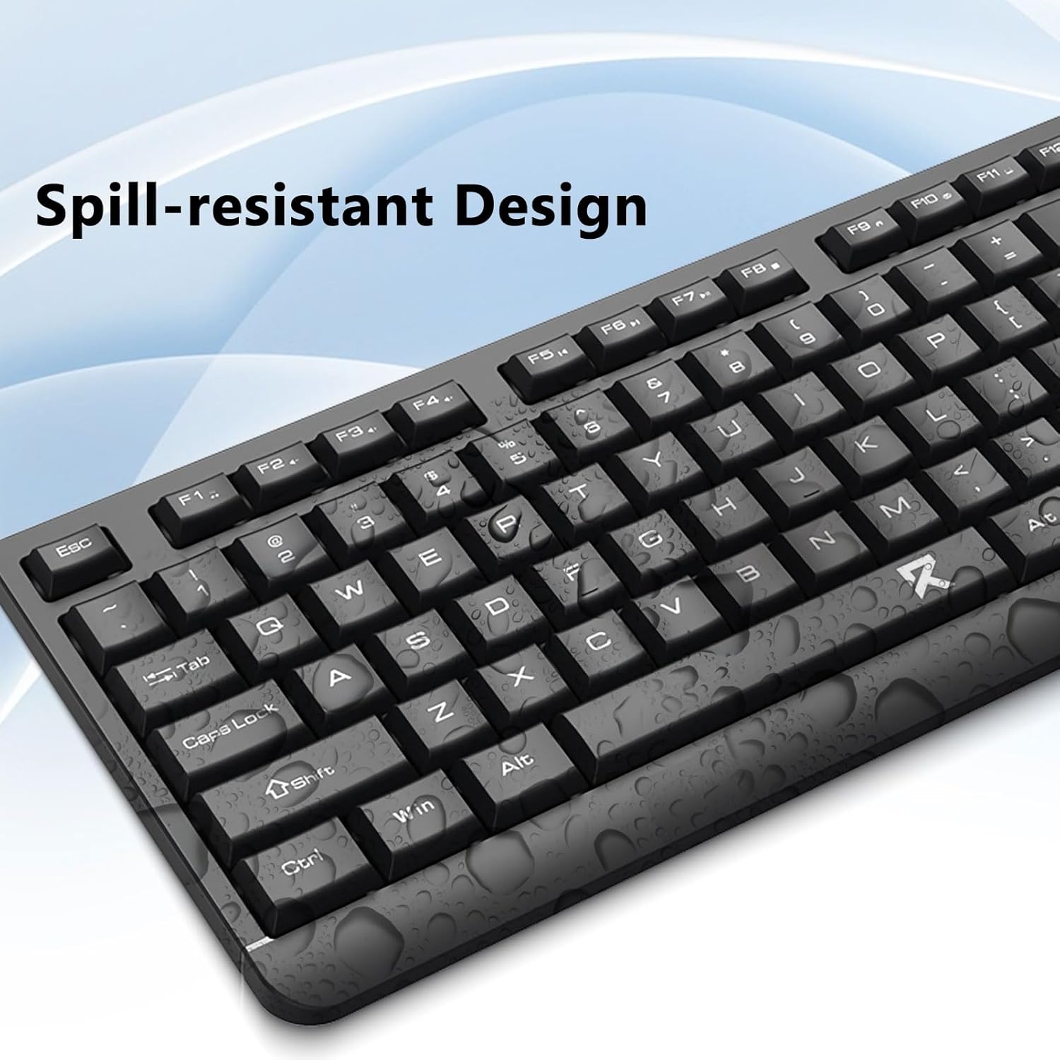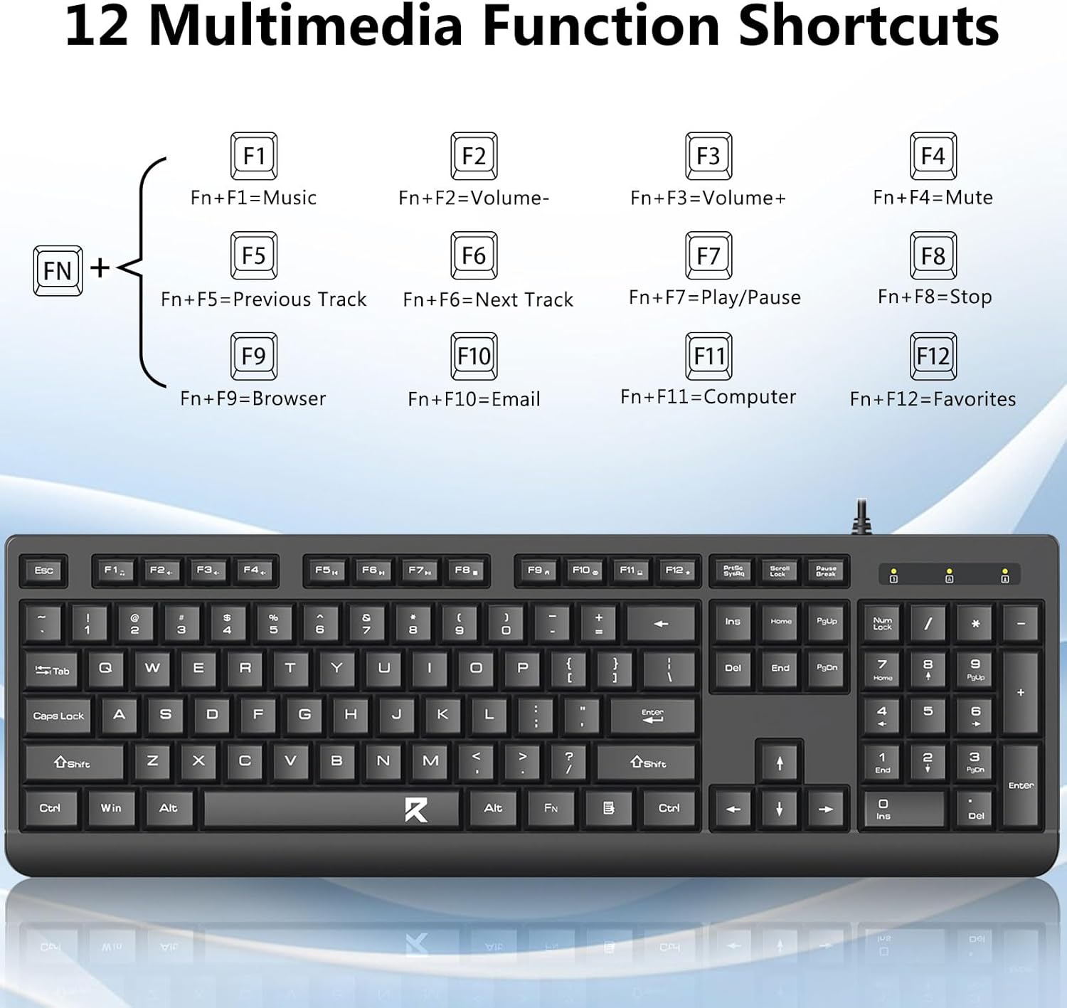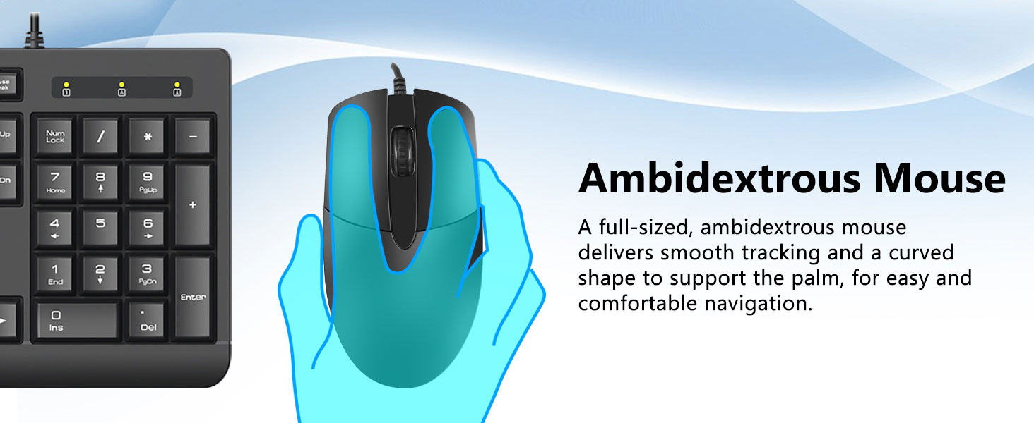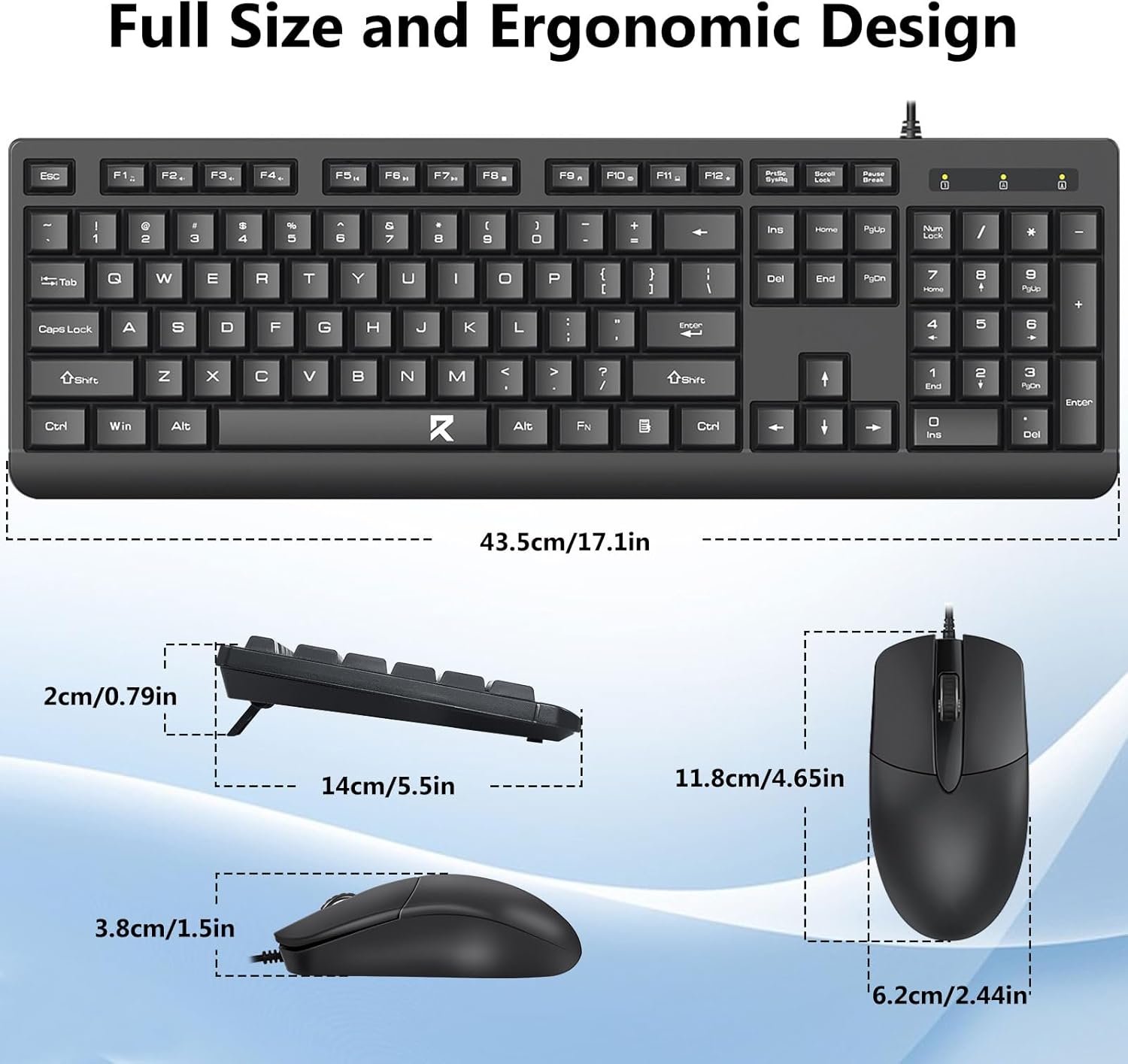 Tastaturoppsettet i full størrelse inkluderer et numerisk tastatur, multimedietaster og komfortabel avstand mellom tastene. Den medfølgende musen er designet for nøyaktig sporing og jevn markørbevegelse over ulike overflater.