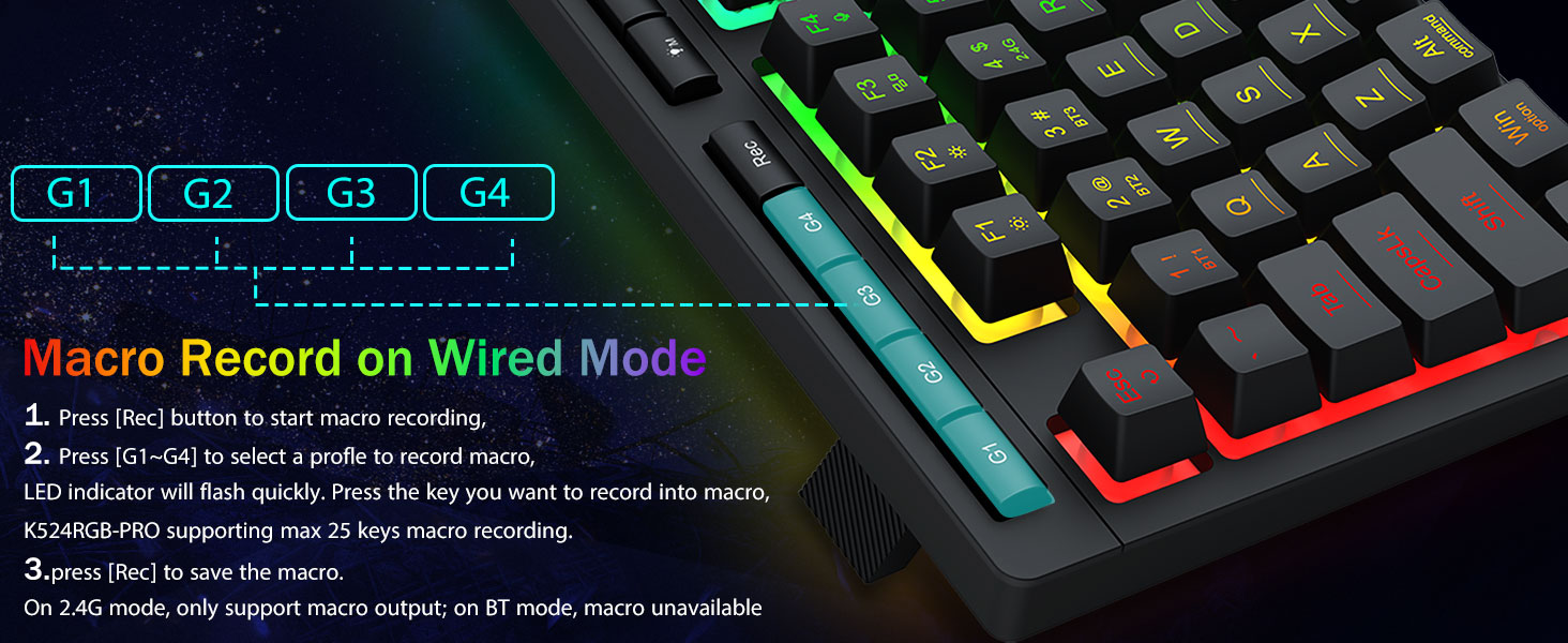 Tilpassbare makroer, uanstrengt kontroll- Programmer de 4 innebygde makrotastene (G1-G4) umiddelbart – ingen programvare kreves. Ta opp komplekse kombinasjoner for spill, snarveier for produktivitet eller mediekommandoer. Redefiner arbeidsflyten din på sekunder. Du kan også bruke programvare til å tilpasse funksjoner, lage makroer, justere RGB-lys og angi snarveier.