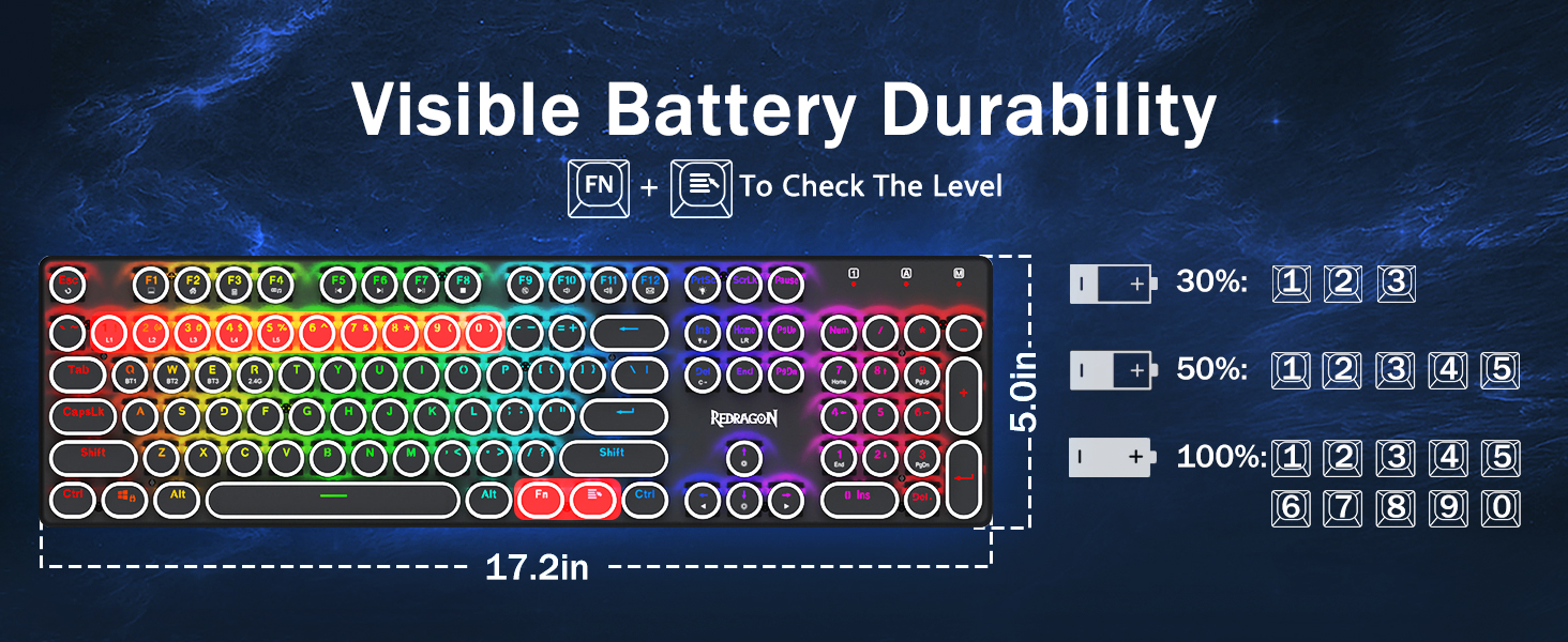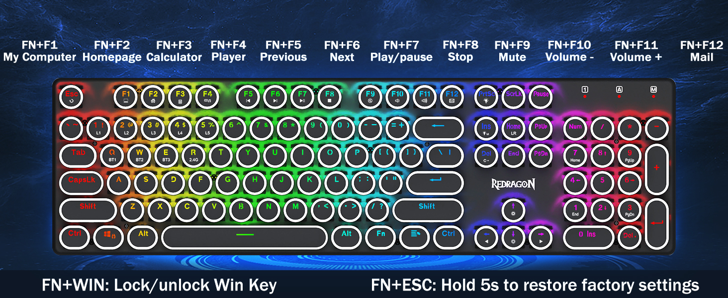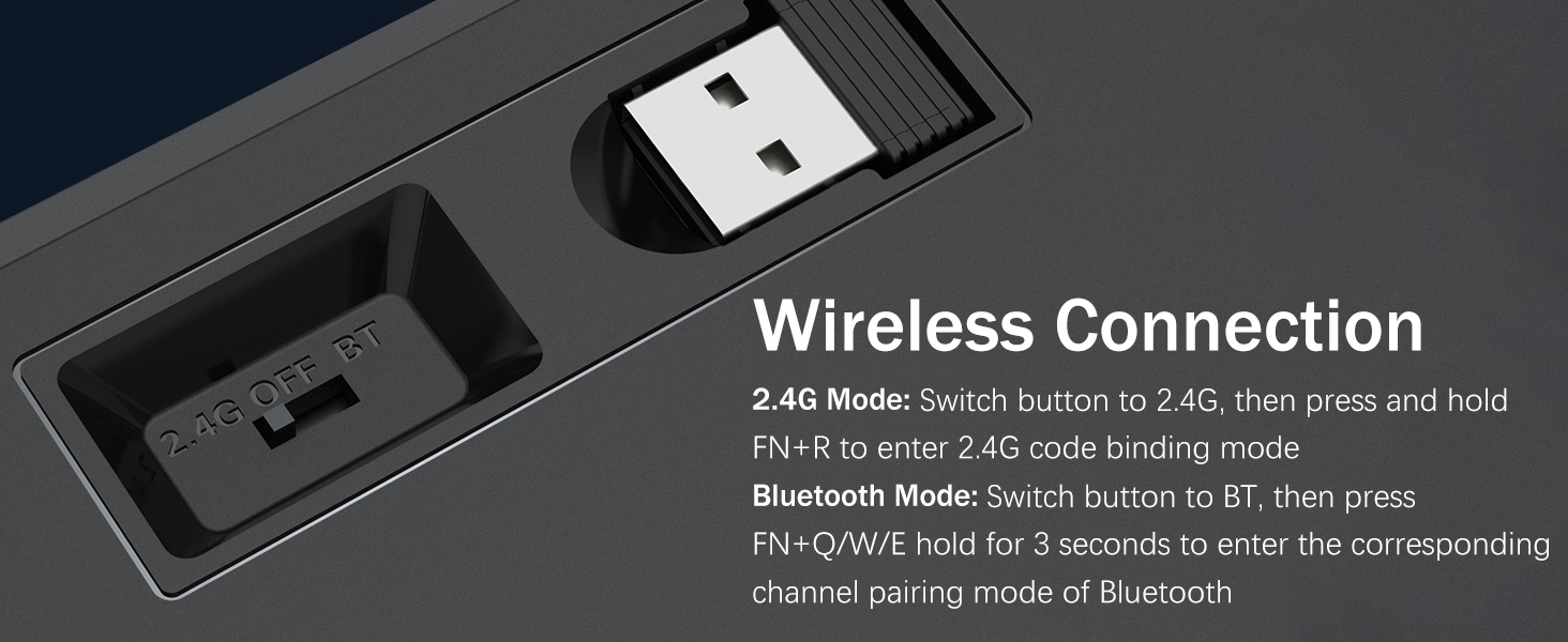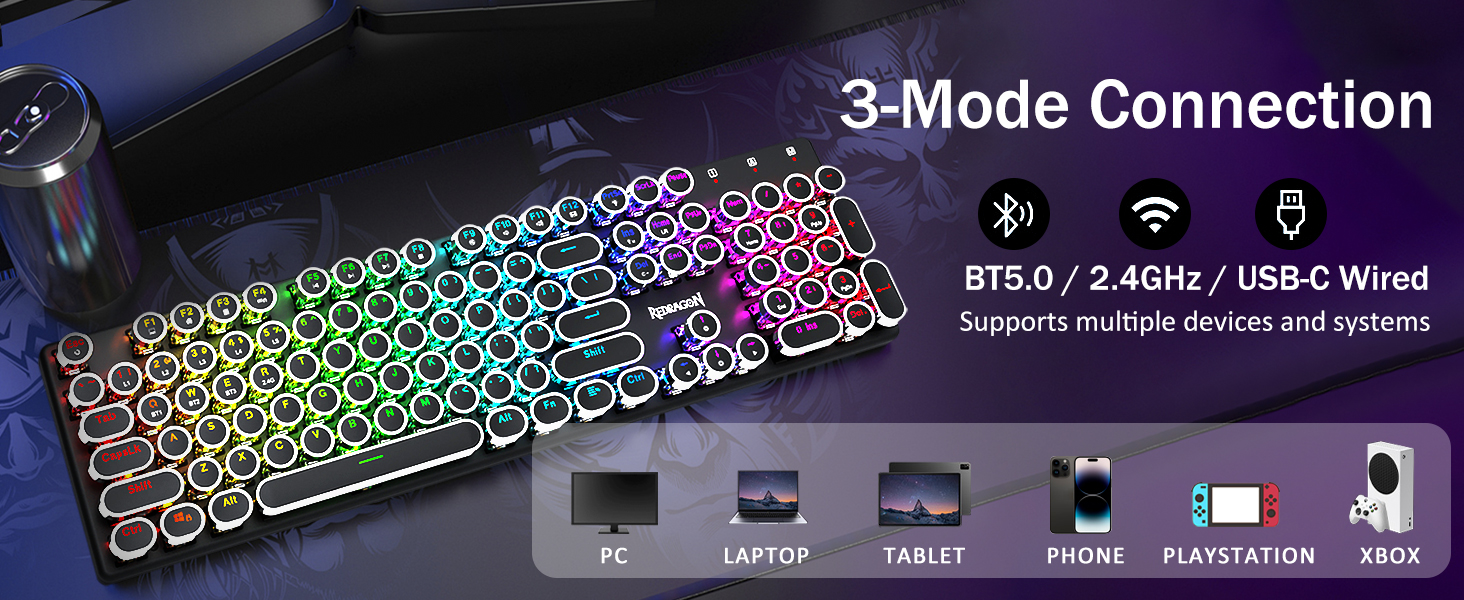 𝟯-𝗠𝗼𝗱𝗲 𝗖𝗼𝗻𝗻𝗲𝗰𝘁𝗶𝗼𝗻 -Utstyrt med Redragon innovative tri-mode tilkoblingsteknologi, USB-C kablet, Bluetooth 5.0/3.0 & 2.4Ghz trådløse moduser som gjør brukeropplevelsen oppgradert til et annet nivå på alle felt. Trykk FN+Q/W/E til Bluetooth-modus, trykk FN+R til 2.4G-modus.