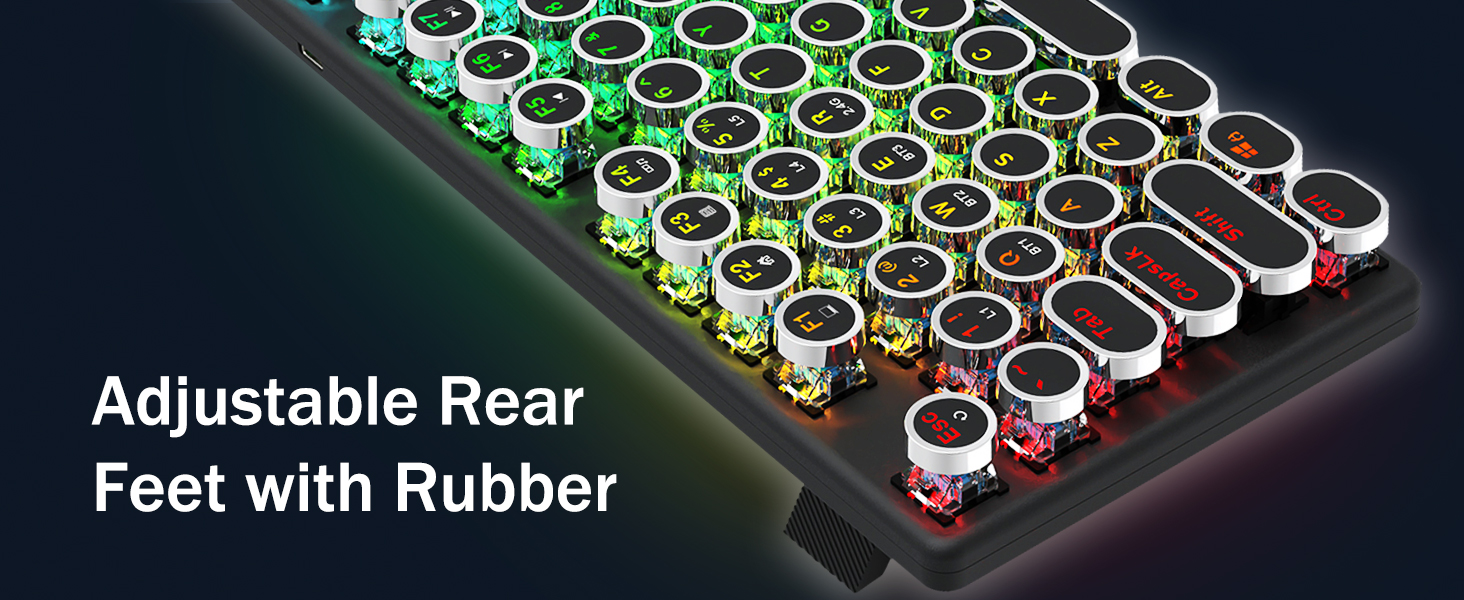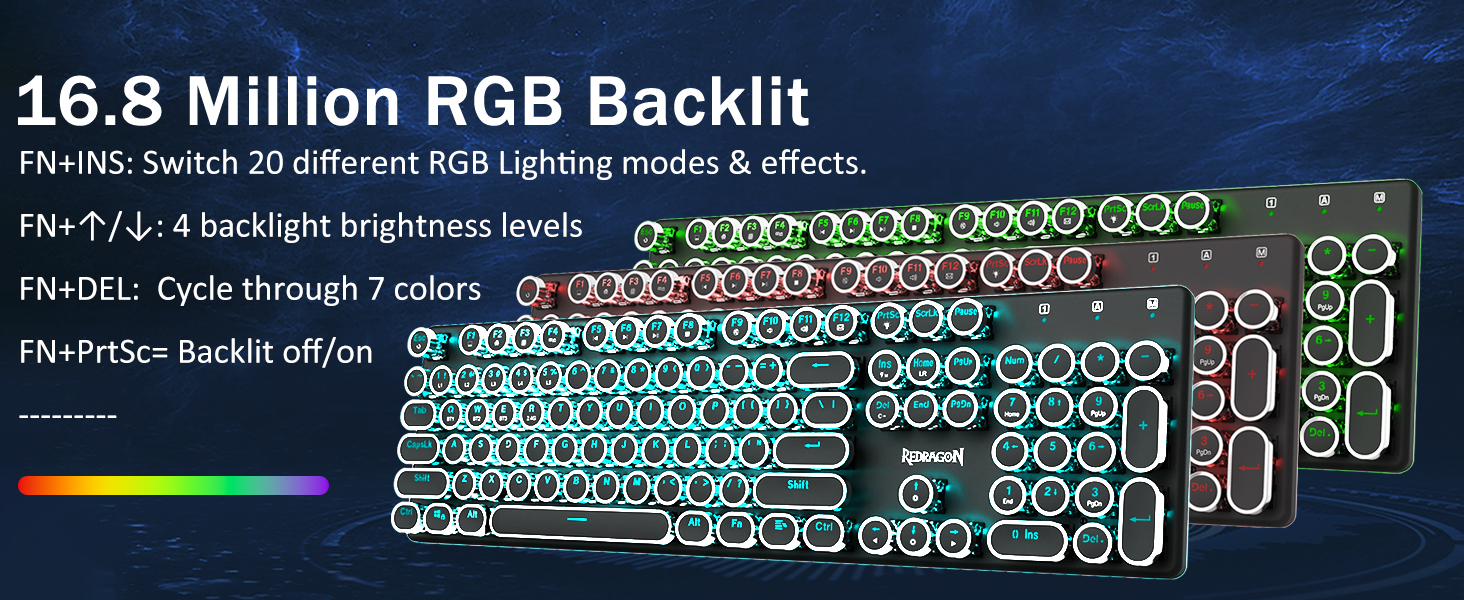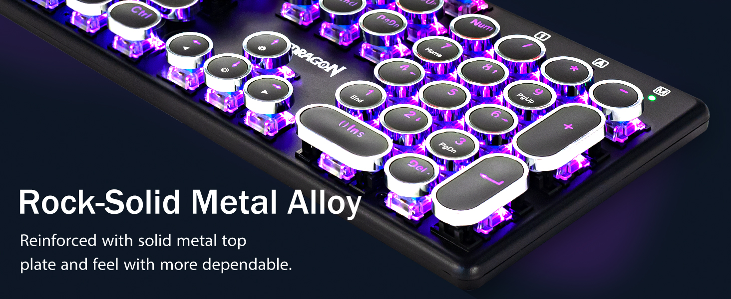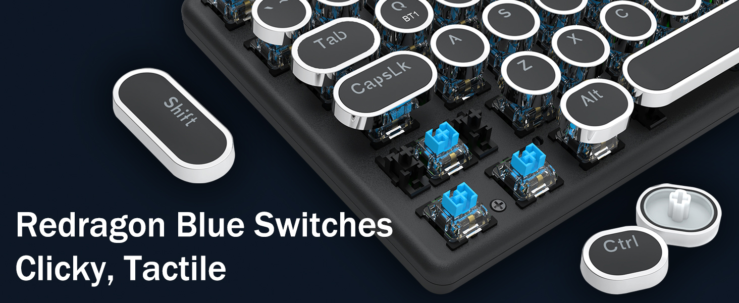 𝗥𝗲𝘁𝗿𝗼 𝗧𝘆𝗽𝗲𝘄𝗿𝗶𝘁𝗲𝗿 𝗦𝘁𝘆𝗹𝗲 𝘄𝗶𝘁 𝗠𝗲𝗰𝗵𝗮𝗻𝗶𝗰𝗮𝗹 𝗞𝗲𝘆𝘀 -Redragon Mechanical blå brytere tilbyr middels motstand, hørbar klikkklatt lyd og taktil tilbakemelding, gir responsivt og presist spillmiljø og ytelse. Vintage runde steampunk-tastaturer ser ut som en klassisk skrivemaskin, gir deg komfortabel skrivefølelse og stabil klikkberøring.