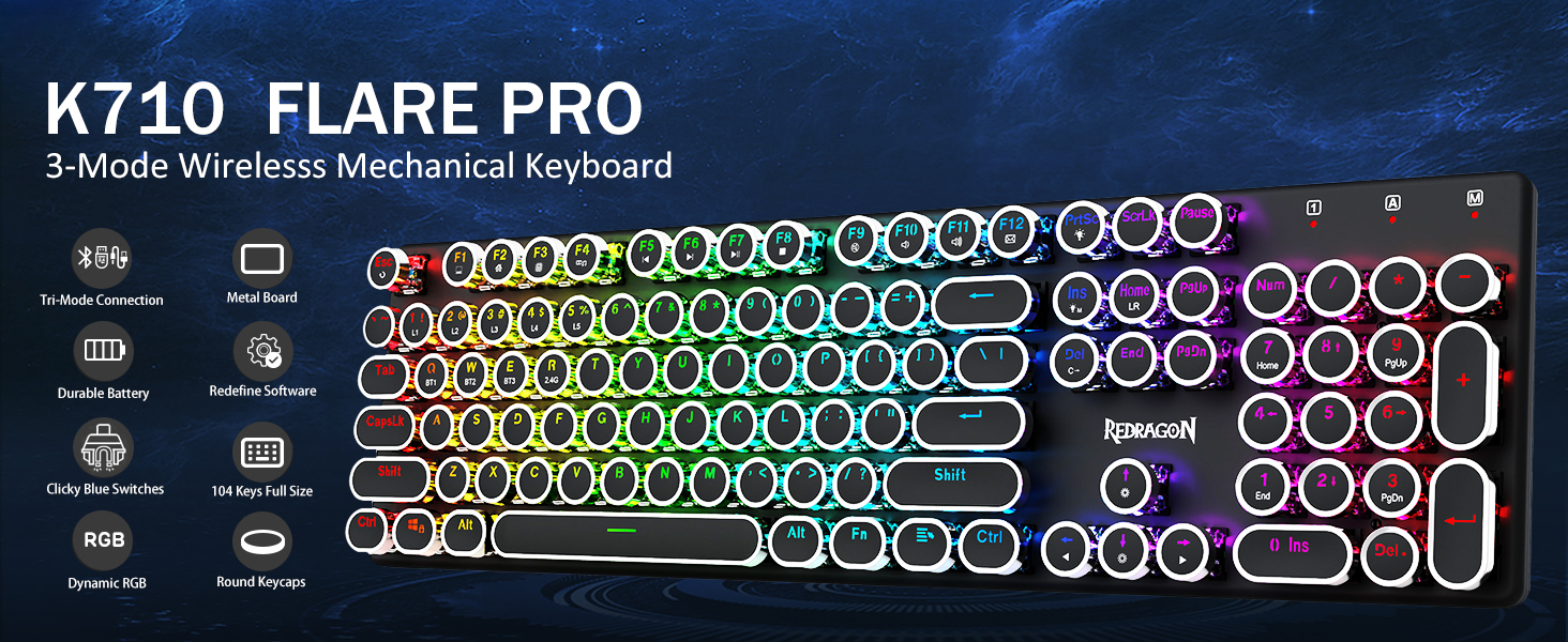 Oppgradert FLARE PRO-versjon fortsetter å bruke det samme tankfaste metallmaterialet. Hold tastaturet stødig og elegant på skrivebordet, for en førsteklasses skriveopplevelse. K710-tastaturet støtter 104-tasters anti-ghosting-teknologi, gjør at flere taster kan trykkes samtidig uten konflikt.