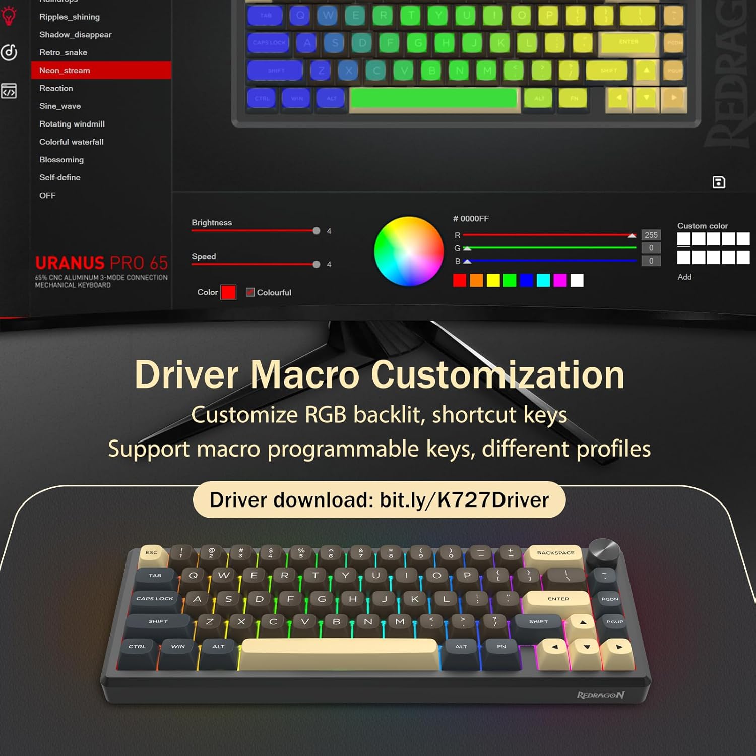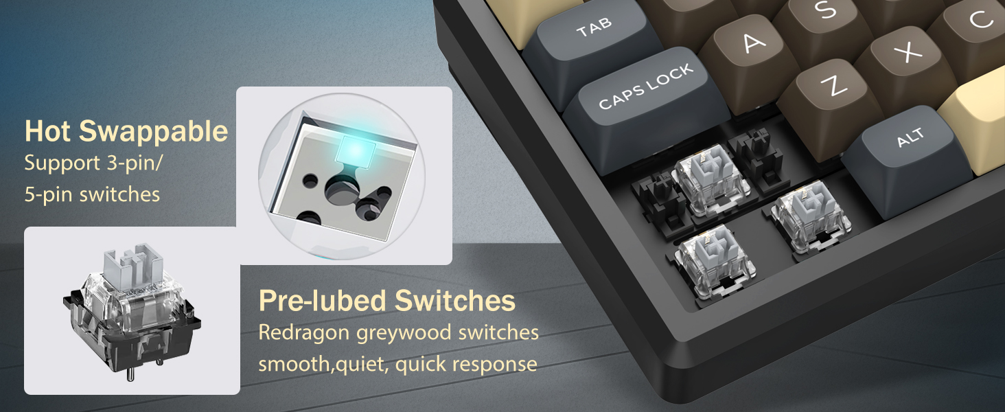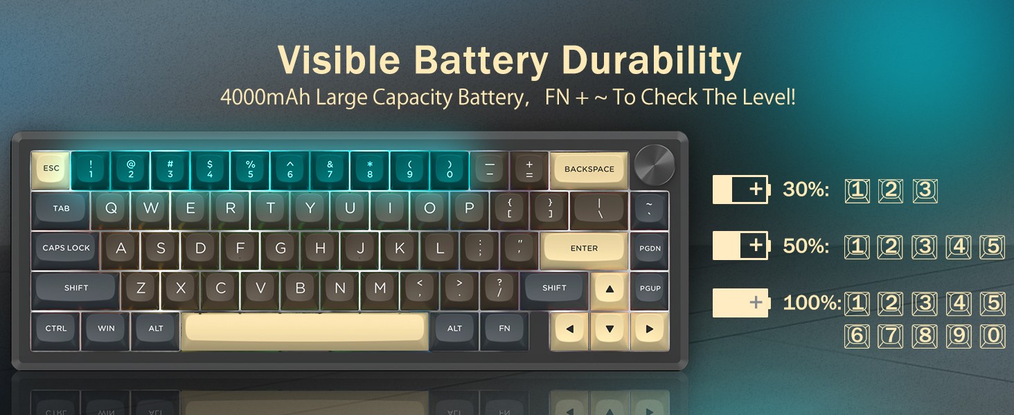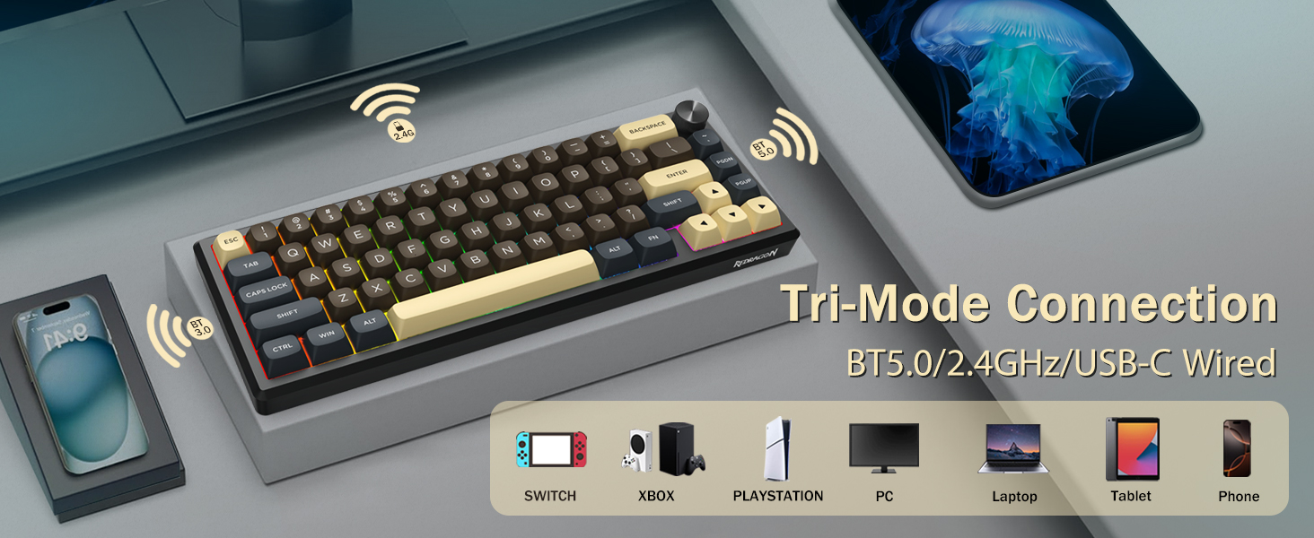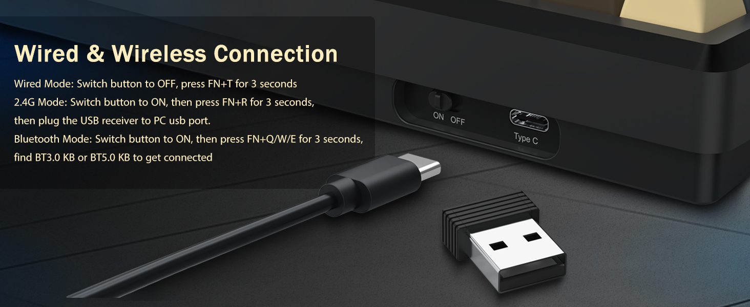 Tastaturet støtter trådløs tilkobling for enkelhets skyld og en kablet USB-tilkobling for stabil ytelse. Brukere kan bytte mellom moduser avhengig av oppsettet deres.