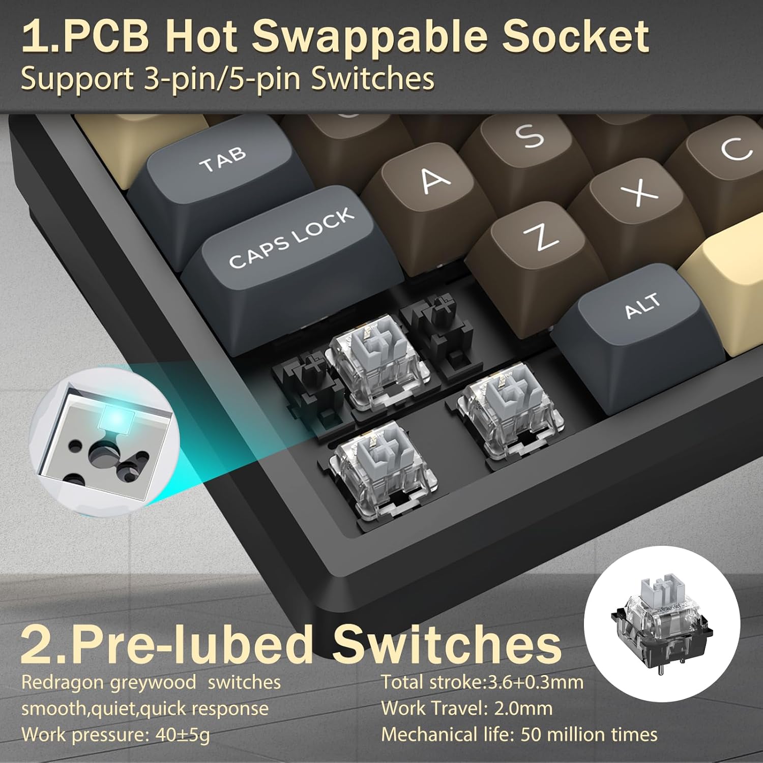 Utstyrt med mekaniske brytere, gir tastaturet konsekvent aktivering og taktil tilbakemelding. Dette støtter nøyaktig skriving og pålitelig inndata for spill- og arbeidsoppgaver.