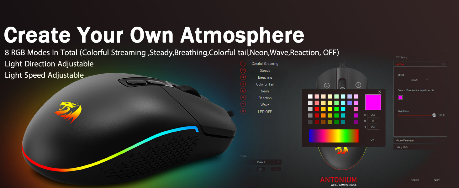 Enhver knapp kan tilordnes på nytt- Slå på bakgrunnsbelysningen og gjør noen drap på spillkampen din. Den hypede dynamiske RGB-bakgrunnsbelyste stemningen vil aldri svikte deg når du dekorerer spillplassen din, det ville vært bedre med annet Redragon-tilbehør med lys på.