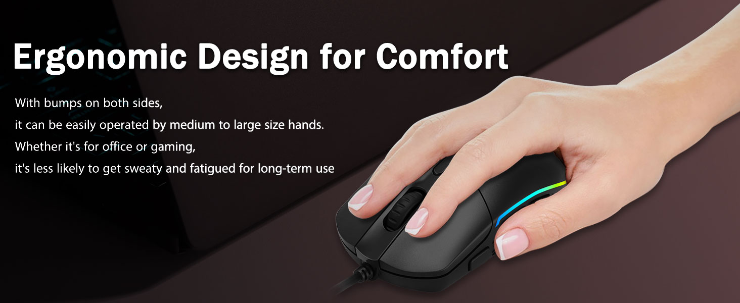 Komfort grep- De ergonomiske ujevnhetene på begge sider gjør at spillmus passer i alle hender. Det gir langvarig komfort for spillere, uten tretthet selv under lange timer med intens spilling. Den sklir ikke når du løfter spillmusen eller gjør raske og presise sveiper.