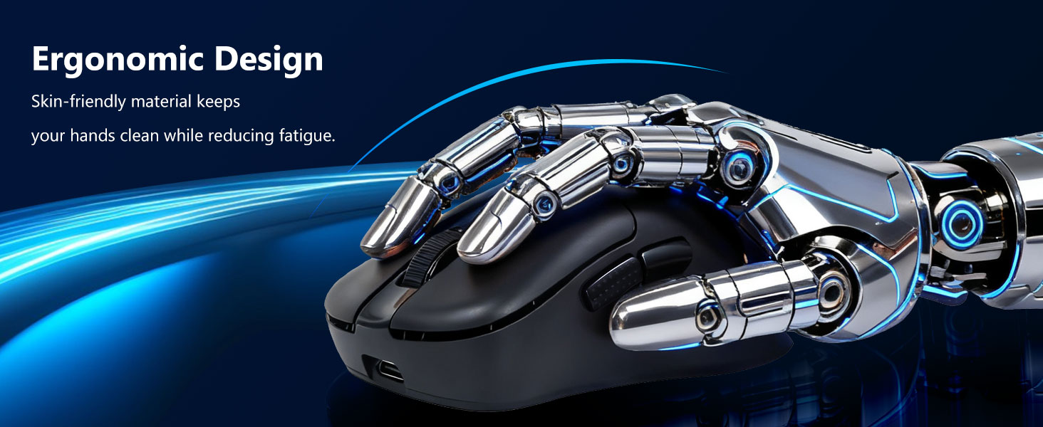Musen er formet for å støtte naturlig håndposisjonering, og tilpasser seg forskjellige grepstiler. Dette bidrar til å redusere tretthet ved langvarig bruk.