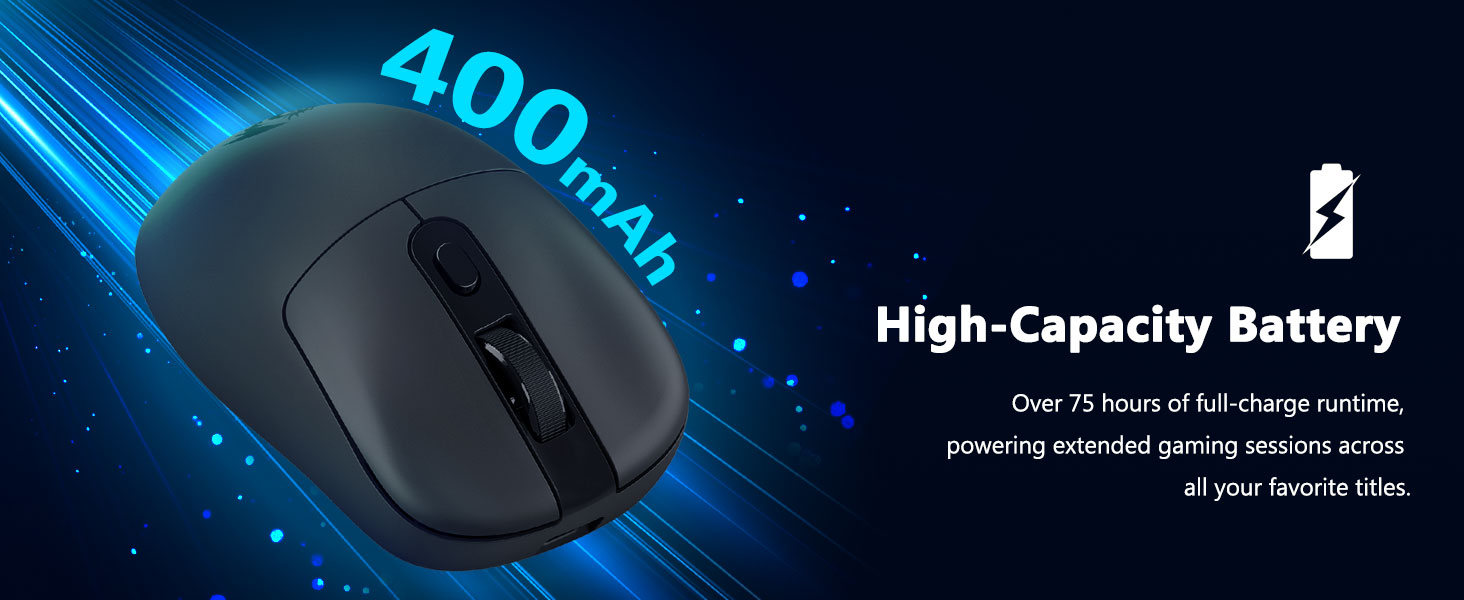 Et innebygd oppladbart batteri gir lengre brukstid. Brukere kan bytte til kablet modus mens de lader, noe som sikrer kontinuerlig drift.