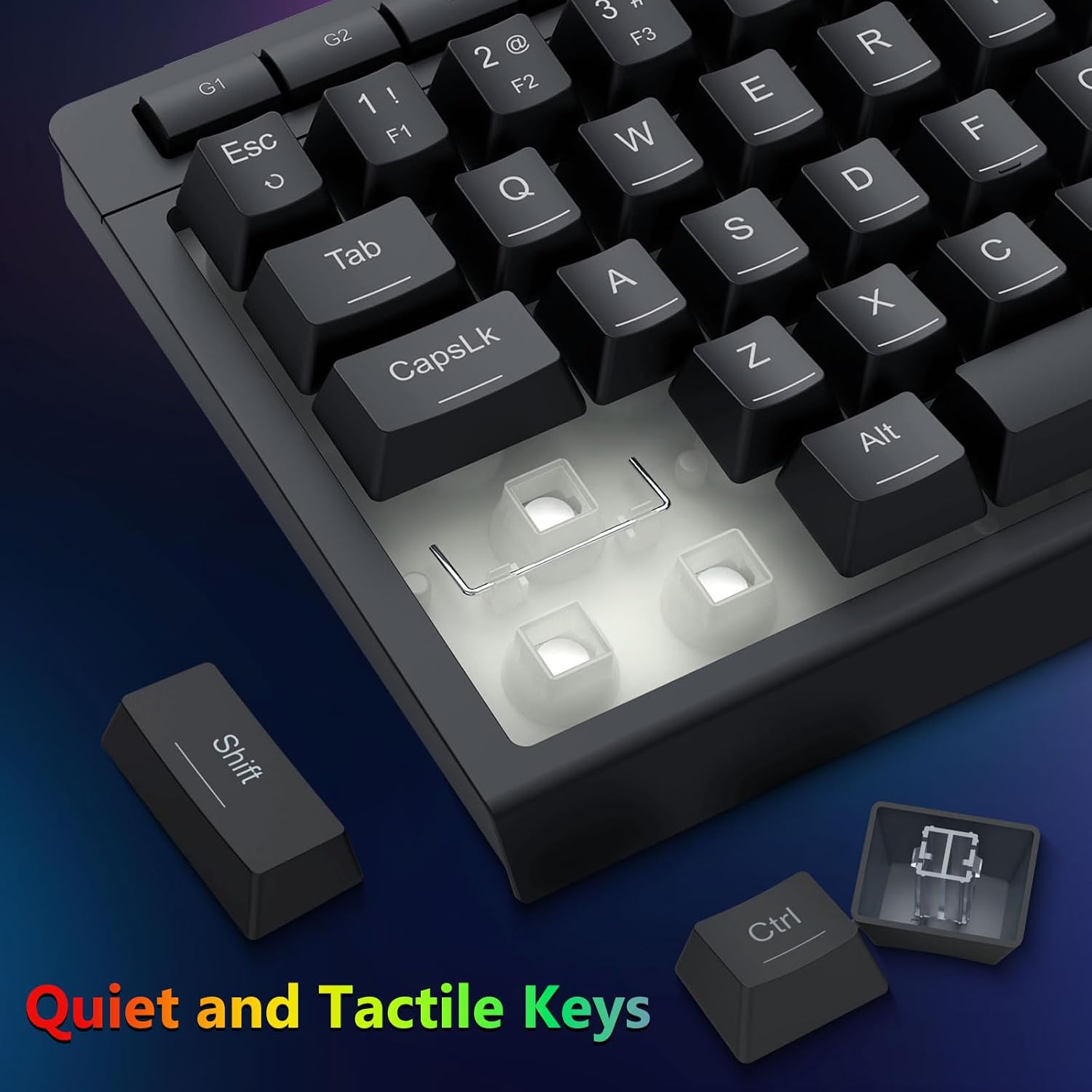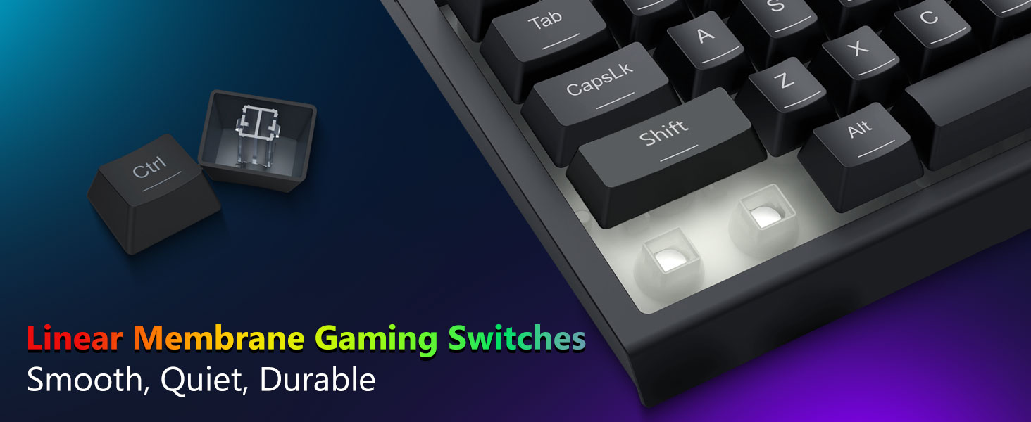 Tastene er konstruert for å gi konsekvent tilbakemelding og balansert aktivering. Dette sikrer nøyaktig skriving og pålitelig inndata under spilling eller kontorbruk.