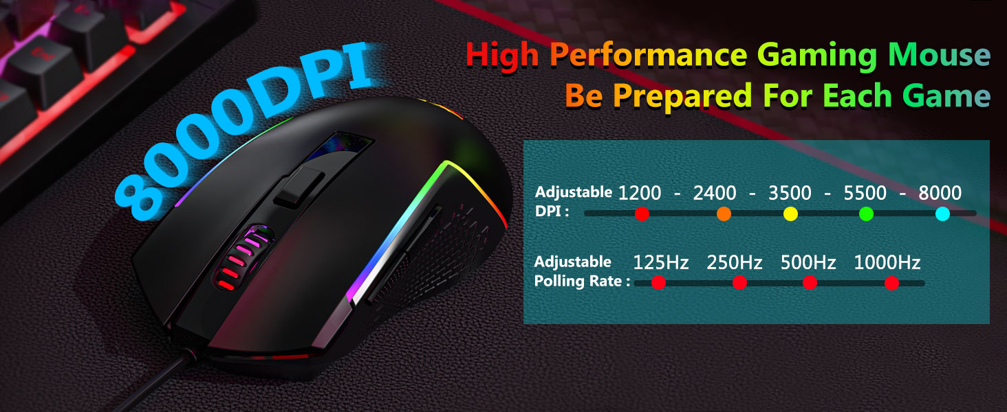 Den medfølgende musen er utstyrt med en optisk sensor som støtter stabil sporing og jevn markørbevegelse. Justerbare DPI-innstillinger lar brukere matche følsomhet med forskjellige oppgaver.