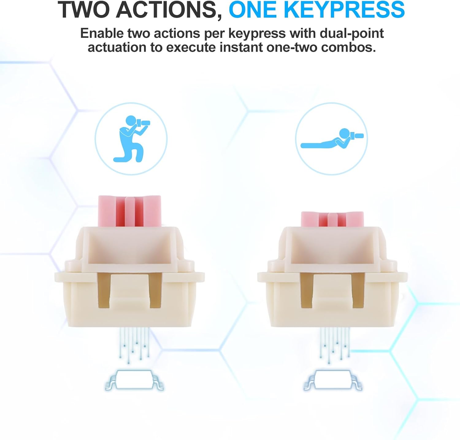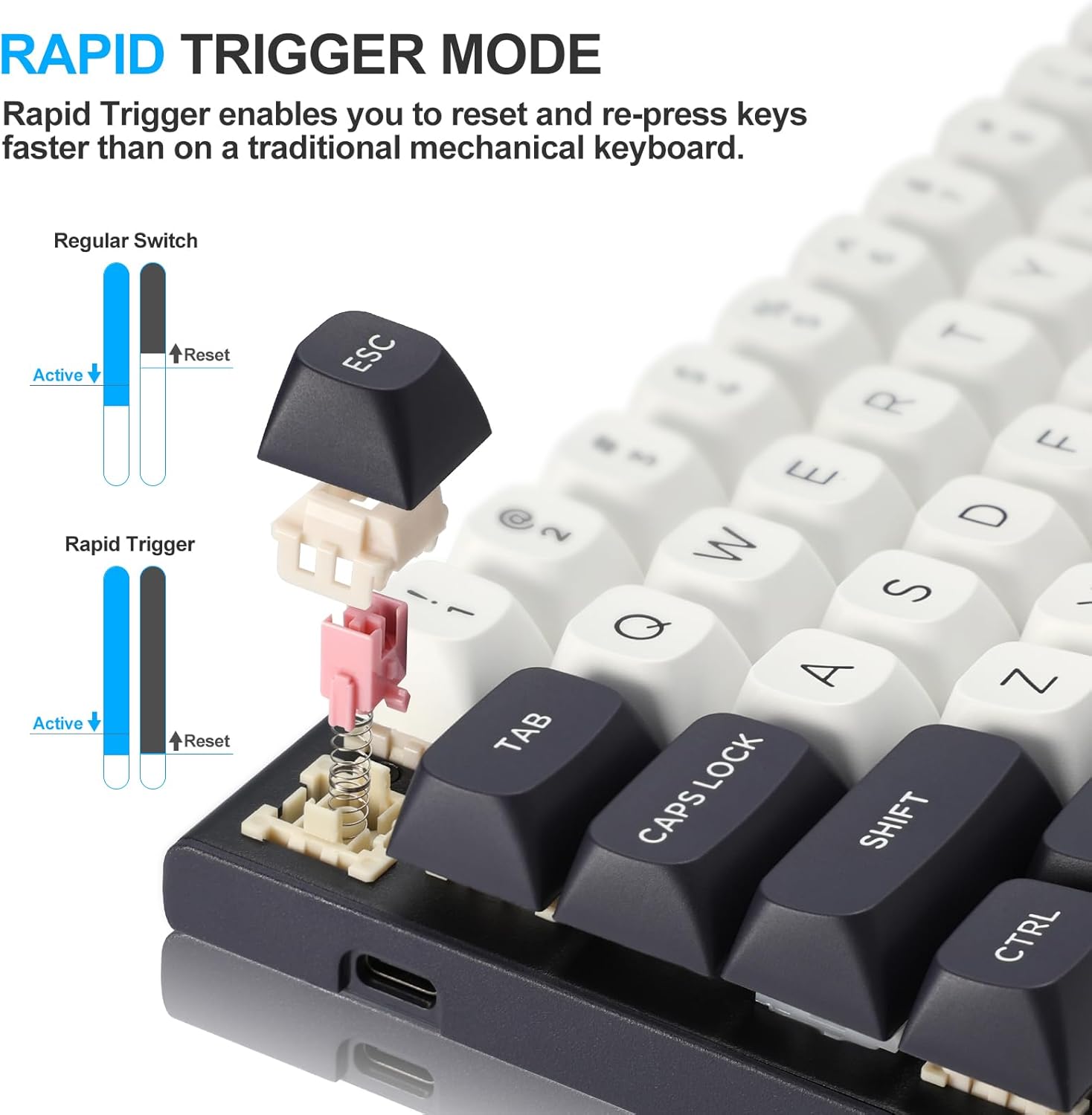 Rask utløserfunksjonalitet lar tastene tilbakestilles umiddelbart når de slippes, i stedet for å vente på et fast tilbakestillingspunkt. Dette muliggjør raskere gjentatte tastetrykk og mer presis kontroll, spesielt nyttig i konkurrerende spillscenarier som FPS eller rytmebaserte spill.