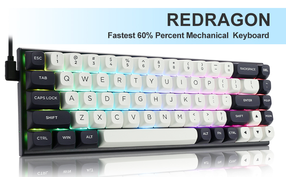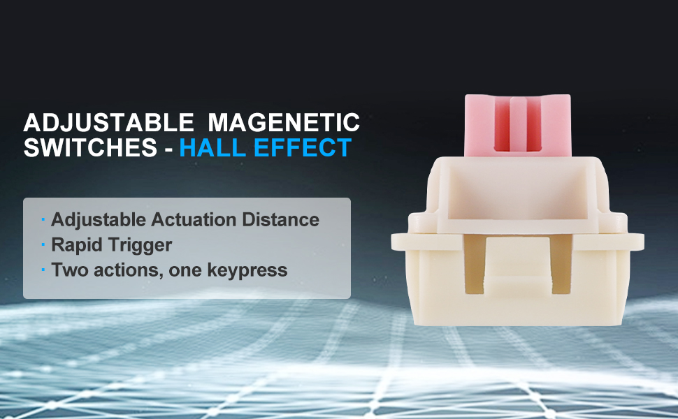 Det hvite/blå-svarte K701 Rapid Trigger 60% kablet magnetisk bryter mekanisk spilltastatur tilbyr en responsiv skriveopplevelse som tilpasser seg forskjellige brukerpreferanser. Justerbare aktiveringspunkter lar brukerne finjustere følsomheten basert på deres behov.