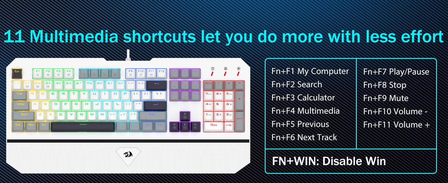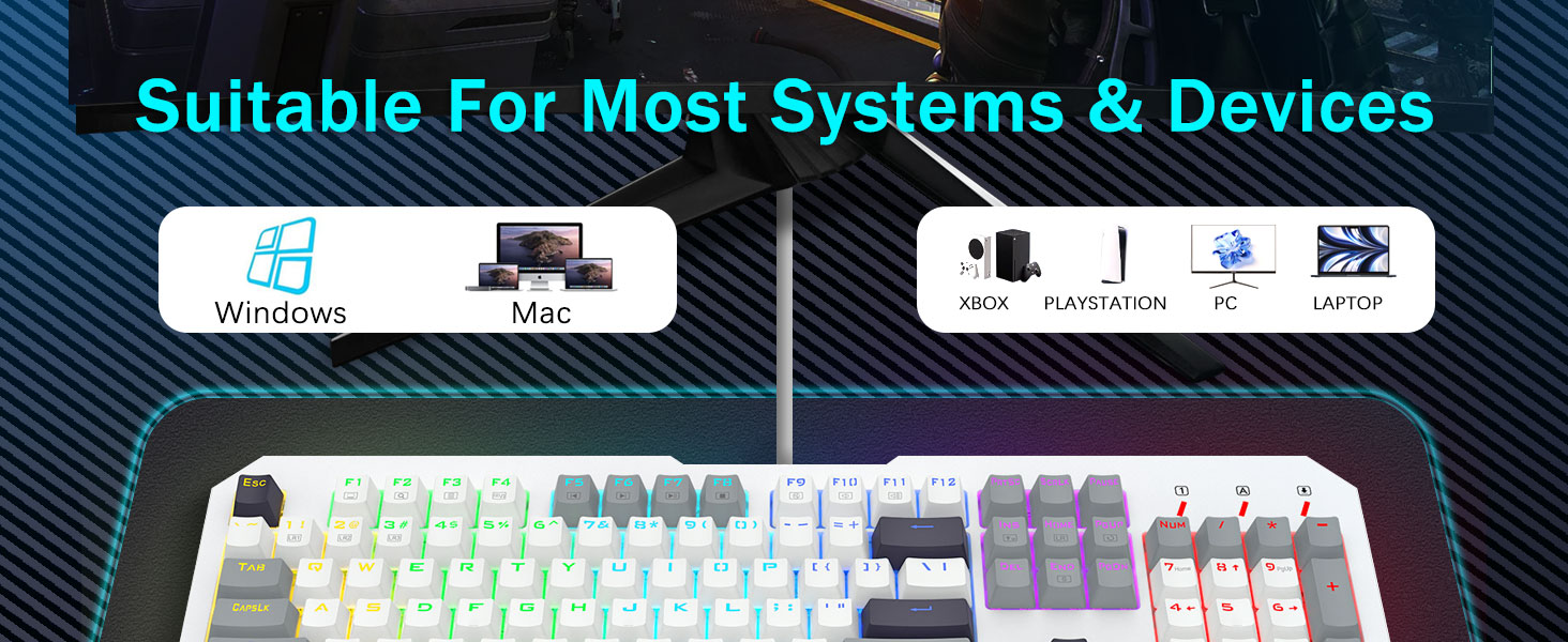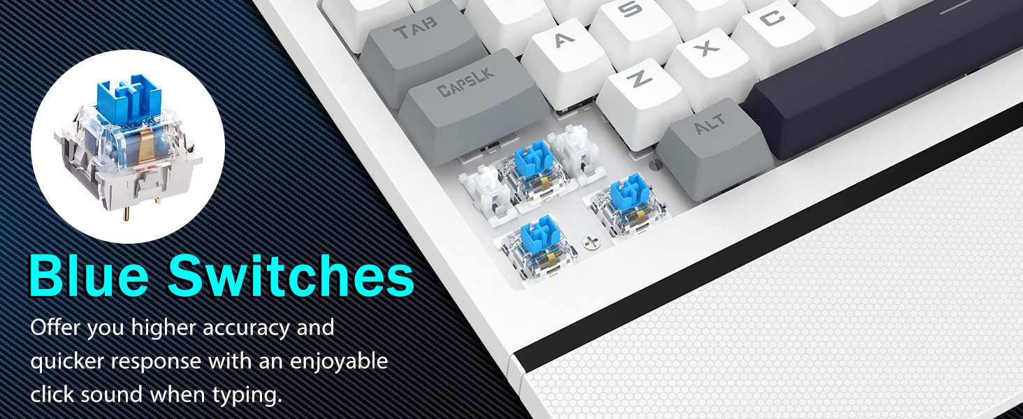 【Responsive blå brytere for presisjonsskriving】PC-tastaturet vårt har klikkblå brytere som gir lyn – raske responstider og bemerkelsesverdig nøyaktighet. Hvert tastetrykk produserer en tilfredsstillende klikklyd, som forbedrer skriveopplevelsen din. Med dypere tastevandring, sterkere tilbakemelding og større tasteavstand er skrivingen ikke bare mer nøyaktig, men også langt mer komfortabel. Hvis du er en fan av den taktile, "klikke" følelsen, er tastaturet vårt det perfekte valget for deg.