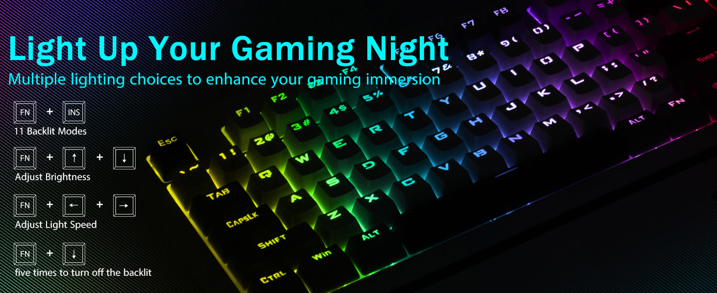 【Rainbow Bakgrunnsbelyst tastatur for en oppslukende opplevelse】Lys opp skrivebordet ditt med 11 dynamiske bakgrunnsbelysningsmoduser, 5 justerbare nivåer av hastighet og lysstyrke. Dette tastaturet er en game-changer for spilloppsettet ditt, og forbedrer humøret og innlevelsen, spesielt i miljøer med lite lys. De ultraholdbare ABS-tastene med dobbel injeksjon sikrer et krystallklart, jevnt bakgrunnsbelysning, som forbedrer skrivenøyaktigheten din selv i mørket.