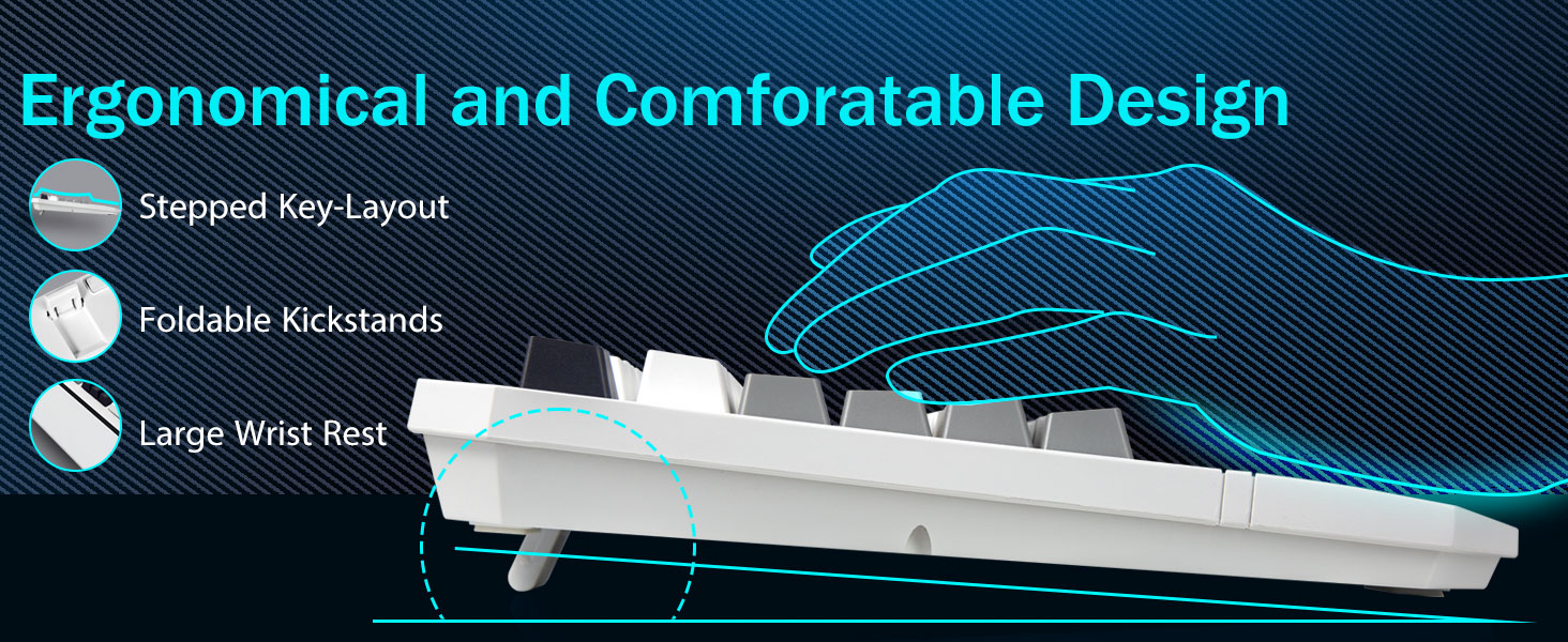 【Avansert ergonomi for komfort hele dagen】PC-spillertastaturet vårt er designet med din komfort i tankene, og har en vitenskapelig trapp-opp-tastaturoppsett og en romslig håndleddsstøtte. Dette oppsettet holder armene i en naturlig posisjon, og reduserer håndtretthet under langvarig bruk. Det kablede tastaturet kommer også med 2 solide, sammenleggbare bakstøtter, slik at du kan justere skråningen for optimal holdning.